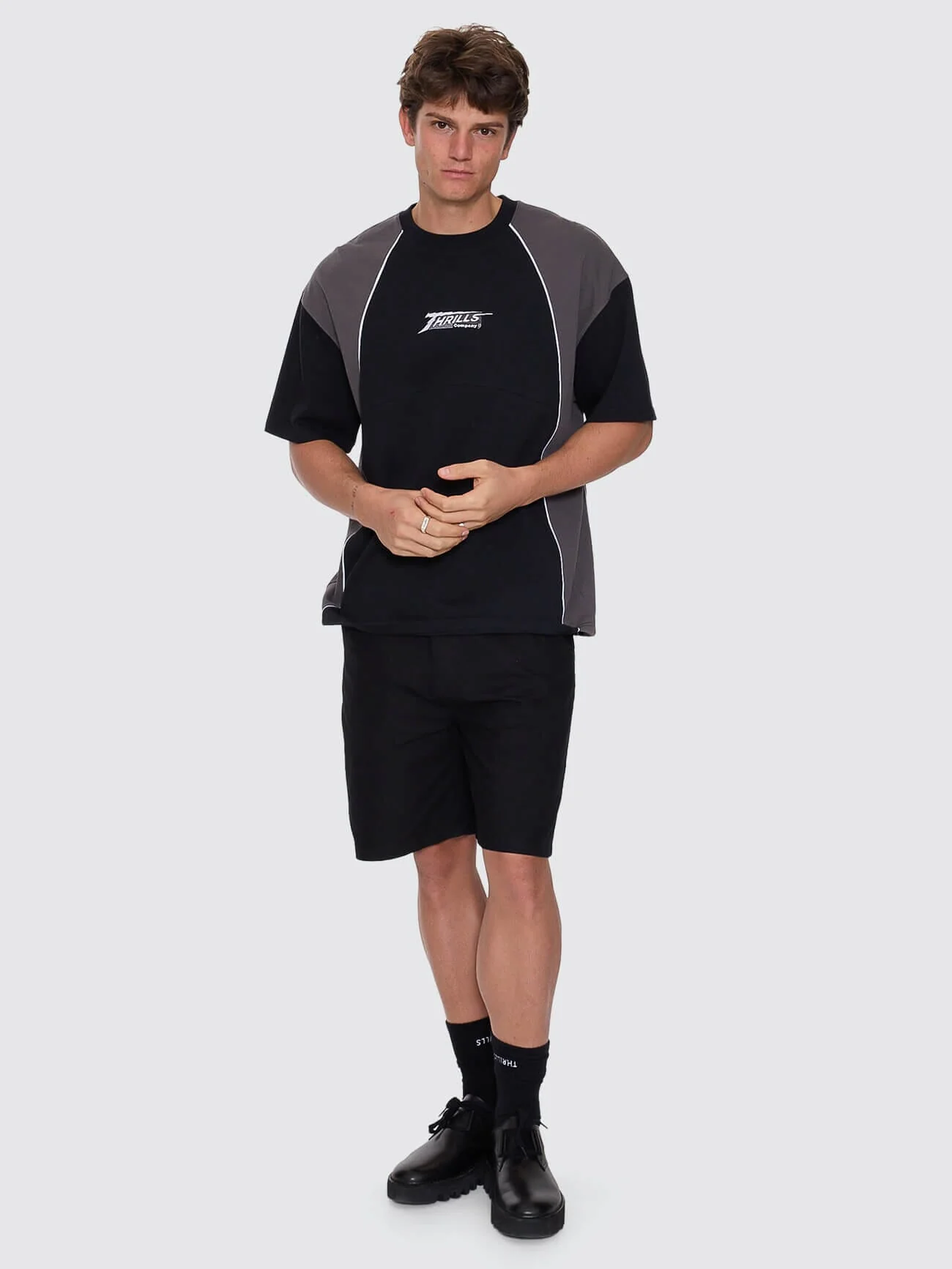 High impact and made to stand out, the Heavy Voltage Box Fit Oversize Cropped Piping Tee in Black brings bold, sporty energy into the streets. Cut from heavyweight dry hand cotton jersey, this men's cropped tee delivers structure with a wide, boxy silhouette and a shorter length that hits just right. Contrast panels and piping add a sharp, motorsport-inspired edge, while the chest embroidery patch finishes it off with subtle Thrills detail. Made to age well, this men's clothing piece pairs well with denim jeans and baggy cargos.