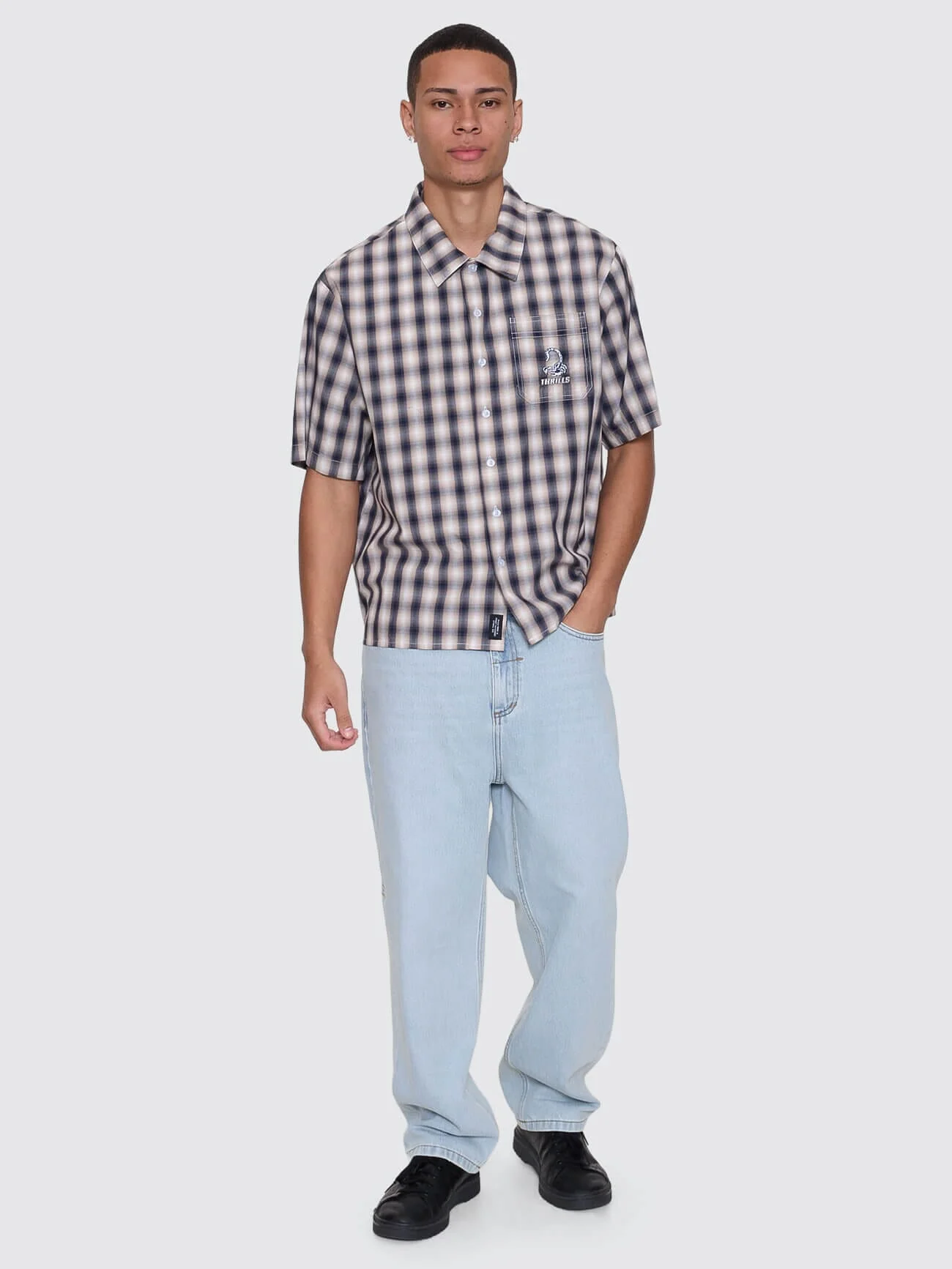 Laid-back with a sharp edge, the Paradise Falling Short Sleeve Cropped Check Work Shirt in Navy is built for warm days and easy nights. The cropped cut keeps things modern, while the yarn-dyed cotton check brings the worn-in, workwear feel Thrills does best. Finished with a button-up front, classic collar, and chest pocket with embroidered detail, this men's work shirt is all about balance. Perfect to dress up or down, this men's clothing staple can be worn loose, layered, or buttoned for a clean, effortless finish. Wear it loose, layer it, or button it clean. A