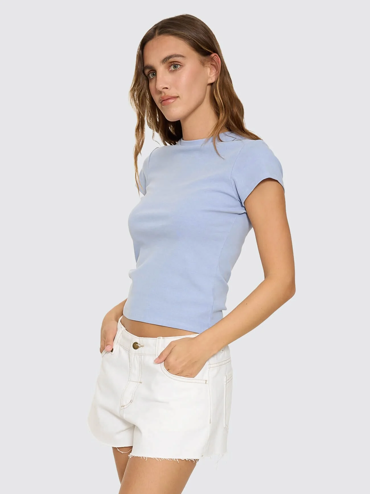 The Thrills Club Tee in Cornflower Blue is your fresh take on a timeless favourite. Designed with a fitted cut, cap sleeves, and a flattering longline length, this women's tee is made from premium fine rib cotton elastane for that perfect mix of comfort and stretch. The soft blue tone adds a fresh, effortless touch of vintage charm, while the subtle Thrills hem label keeps it grounded in authenticity. Pair it with vintage denim jeans or baggy shorts for that easy, everyday uniform.